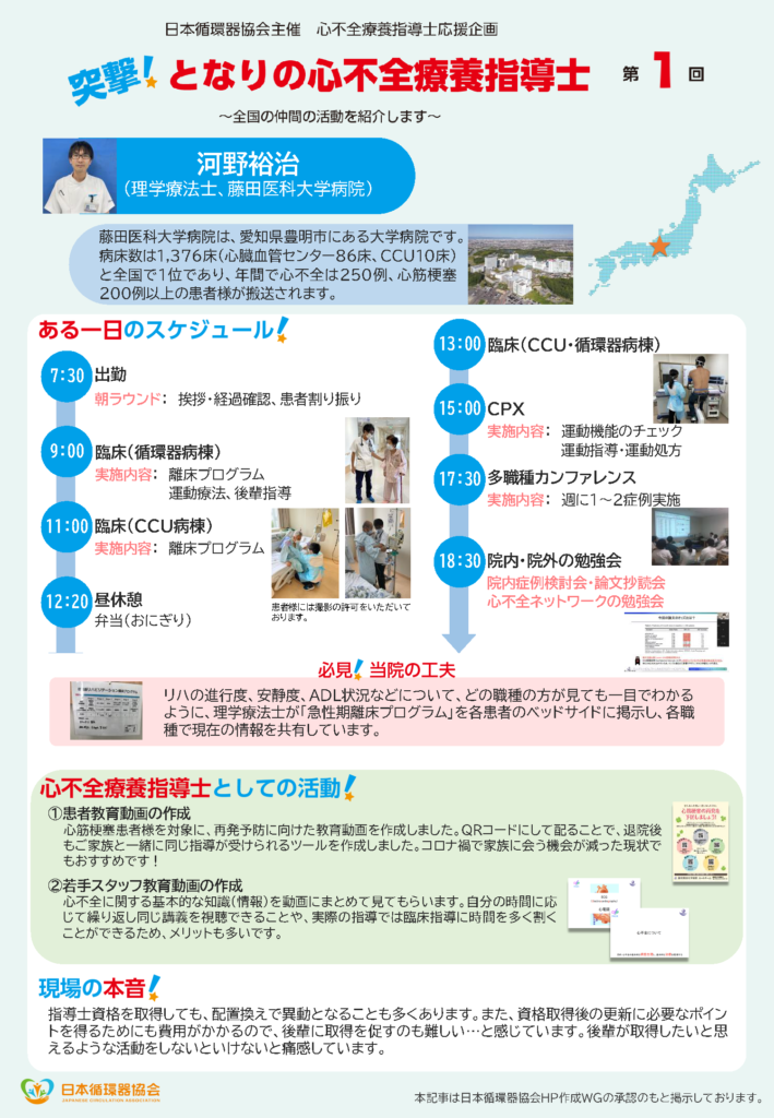 第1回となる今回は、藤田医科大学病院のPTとして活動する河野裕治さんを紹介します。 巨大大学病院で理学療法士として働く河野さんはどのように心不全療養指導士の資格を活かしているのでしょうか?(6分47秒)