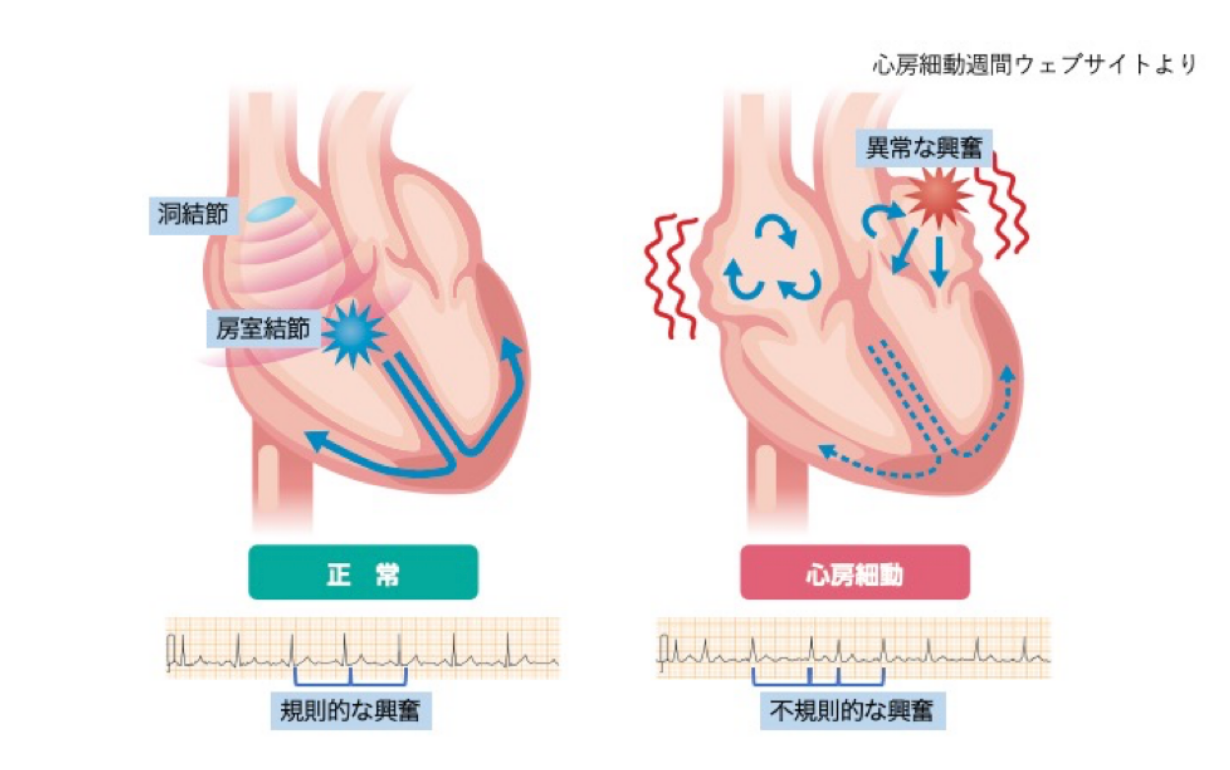 正常な洞調律時の洞結節の役割が、企業における社長で、業務命令(電気刺激)を受け取る心室が社員であるとするなら、心房に偽物の社長が出現し、不規則で多量の業務命令がくることで社員の仕事量が増え混乱を生むのが心房細動です。多量の業務により心房が細かく動く(震える)ためこのように呼ばれています。