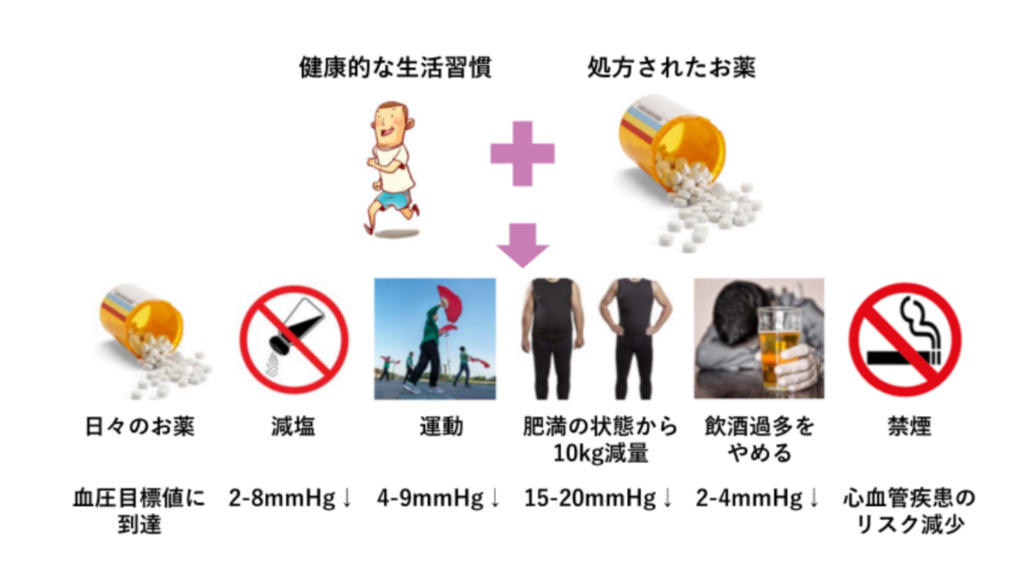 塩分の摂取量を抑えることで血圧を下げる効果があるため、1日あたり6g未満にすることが強く推奨されています。脂質異常症や糖尿病等を合併している場合や、生活習慣の改善だけでは高血圧が改善しない場合は薬の力を借りることになります。処方された薬を決まった時間に飲むことで、1日の血圧が安定して下がり、全身の血管への負担を軽くすることができます。